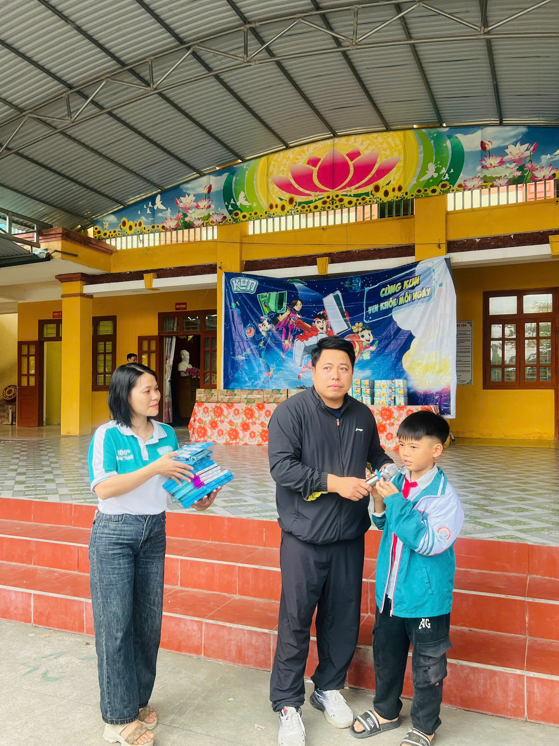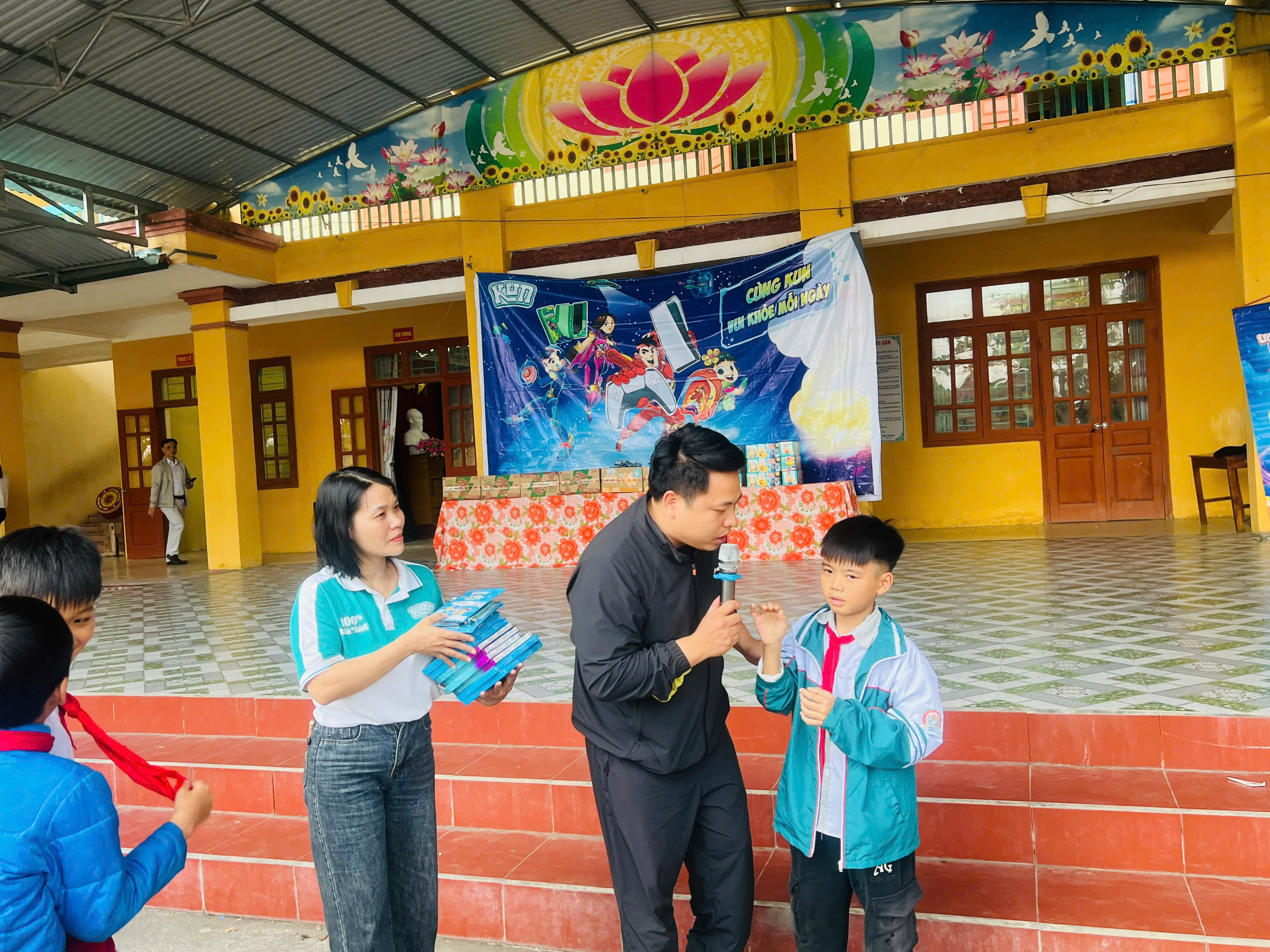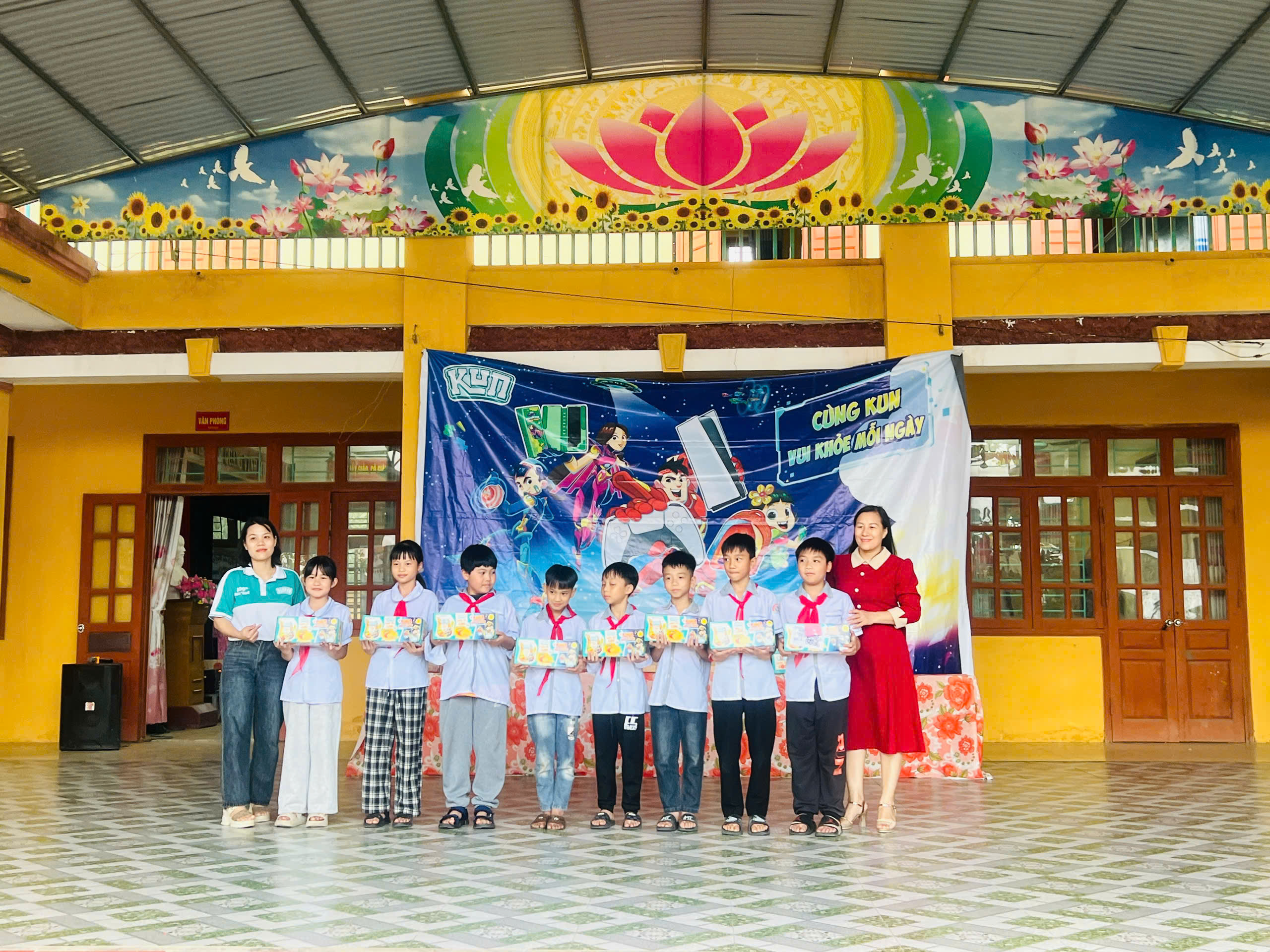 Cũng trong chương trình, Nhãn hàng sữa KUN trao 8 xuất quà tặng cho các em học sinh có hoàn cảnh khó khăn vượt khó vươn lên trong học tập và 15 balo cho các em học sinh có thành tích học tập xuất sắc, 100% các em học sinh toàn trường được uống sữa của thương hiệu KUN và nhận nhiều phần quà hấp dẫn từ nhãn hàng KUN.