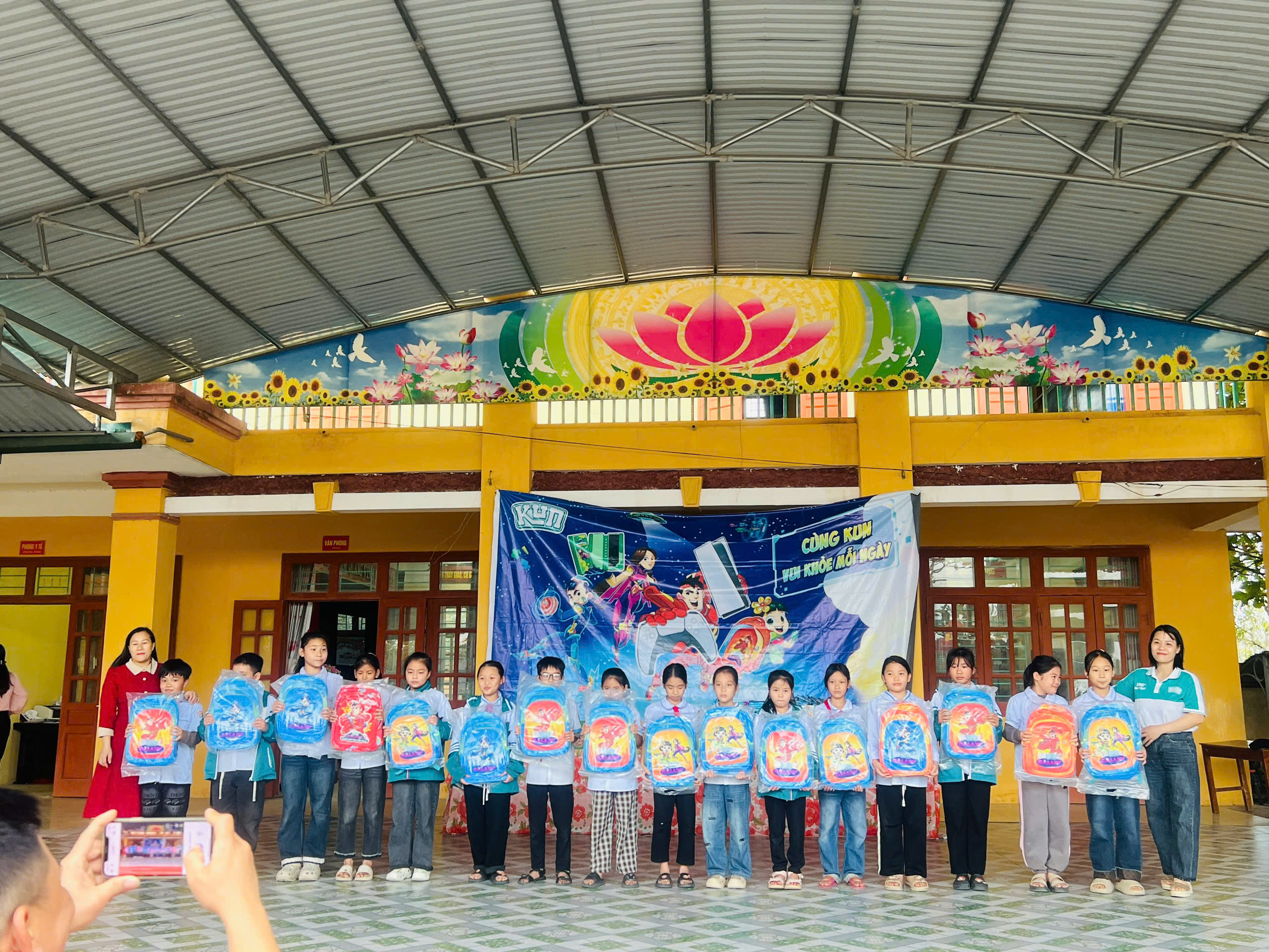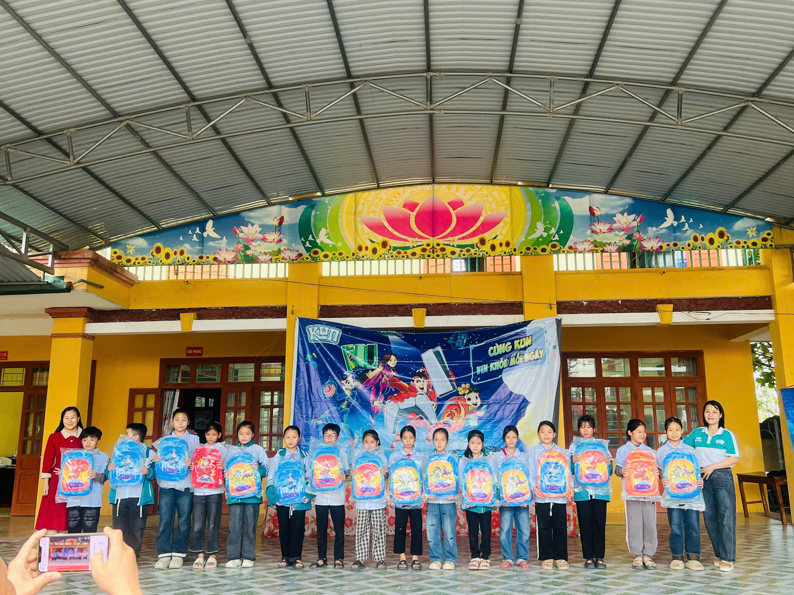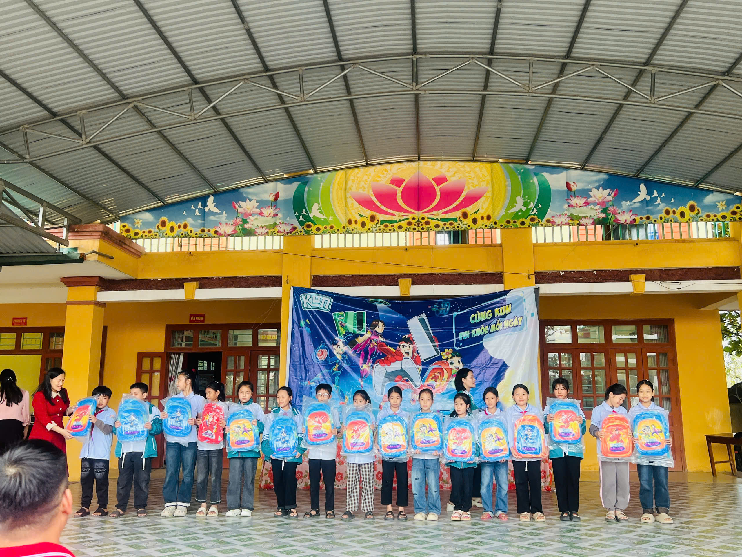 Cũng trong chương trình, Nhãn hàng sữa KUN trao 8 xuất quà tặng cho các em học sinh có hoàn cảnh khó khăn vượt khó vươn lên trong học tập và 15 balo cho các em học sinh có thành tích học tập xuất sắc, 100% các em học sinh toàn trường được uống sữa của thương hiệu KUN và nhận nhiều phần quà hấp dẫn từ nhãn hàng KUN.